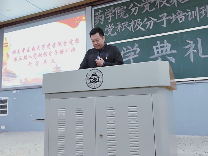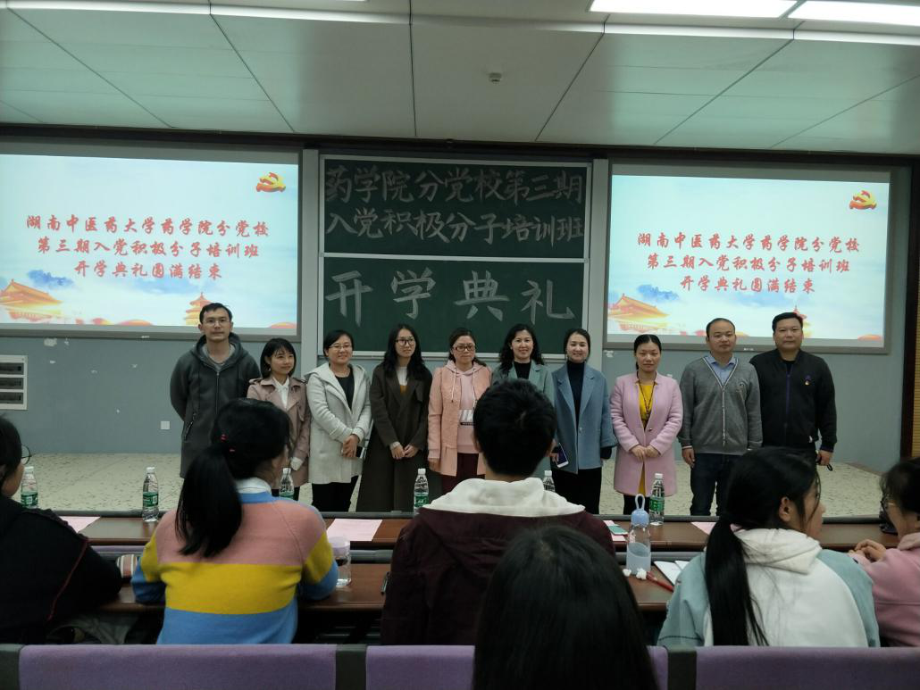 首先,由主持人介绍了到场嘉宾并宣读了培训注意事项。紧接着,开班仪式正式开始,全体起立,奏唱国歌。在热烈的掌声欢迎中,张秋雁书记进行了开学典礼上致辞,她结合党的十九大报告,强调了关于党的精神与原则,并对全体学员提出了四点殷切希望:第一,通过学习培训,强化政治追求,坚定理想信念;第二,通过学习培训,提高对党的基本知识的了解;第三,通过学习培训,端正入党动机,积极创造条件加入党组织;第四,大家严格遵守学习纪律。随后,由2018级中药学三班张浩杰作为此次入党积极分子培训的学生代表进行了发言,其表达了各位培训学员能够完成培训的决心和毅力,表明了全体学员想要向党组织靠拢的积极态度。最后,由主持人宣布开班典礼圆满结束,各嘉宾上台进行了合影留念。