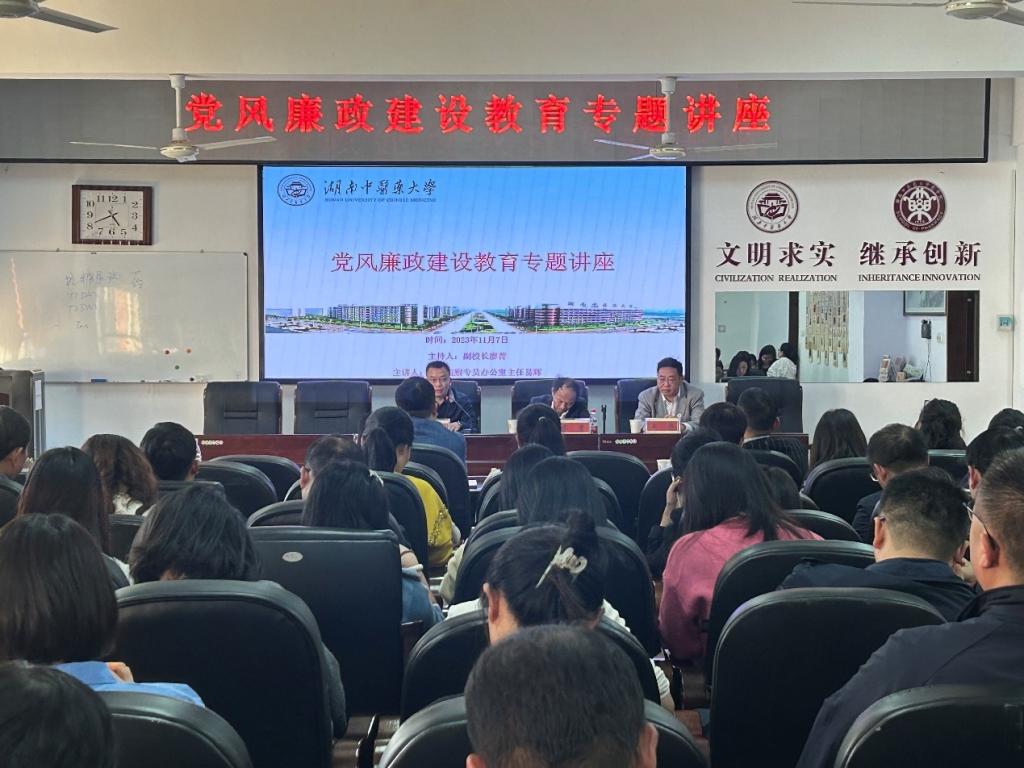 11月7日,学院召开全院职工大会,邀请校纪委副书记、监察专员办公室主任易辉进行“党风廉政建设教育”专题讲座。会议由副校长廖菁主持。