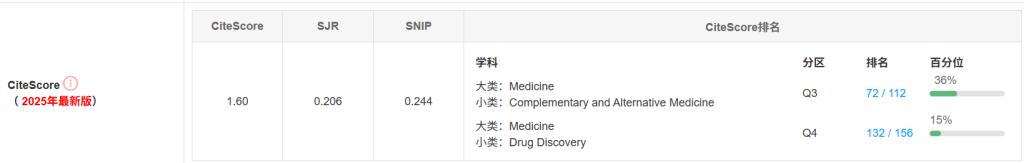 在学科分类上,该期刊归属于医学大类,具体涉及补充与替代医学(Complementary and Alternative Medicine)和药物发现(Drug Discovery)等小类。在2023年,其Cite Score为0.9,而到了2025年,Cite Score已提升至1.6。在补充与替代医学领域,其排名为72/112,处于Q3区;在药物发现领域,排名132/156,处于Q4区。其在补充与替代医学领域的排名提升,有效彰显了期刊的学术质量,对扩大期刊传播范围、增加显示度和提升学术影响力具有重要意义,进一步提升了我校办学质量和科研实力。