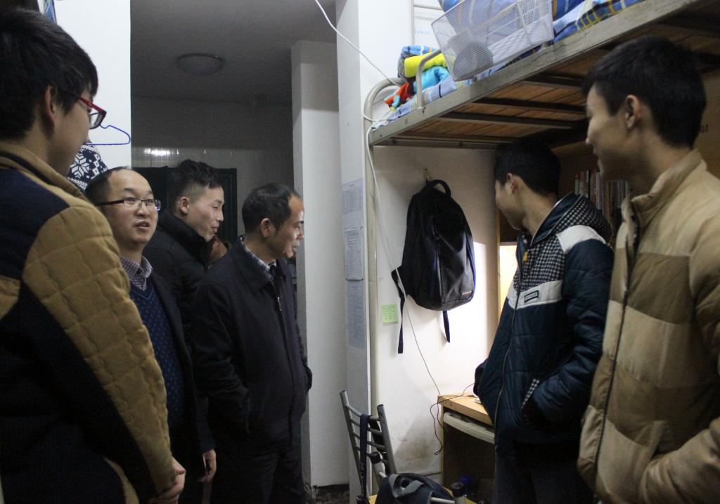 2015年12月16日晚7:00,以关心我院学子的学习和生活环境为出发点,yl23455永利官网党总支副书记、副院长鲁耀邦教授带领学生科全体老师来到学生寝室视察,与同学们进行交流。
