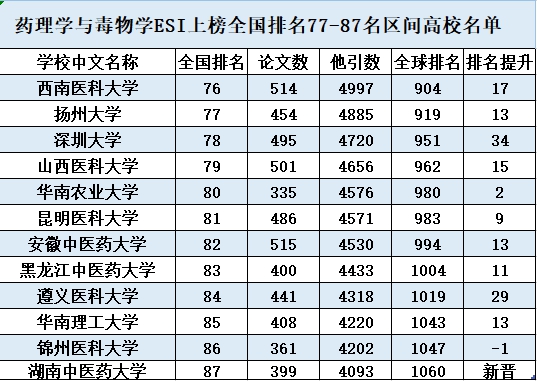 根据2022年3月公布的最新一期排名情况,全国共91个高校的药理学与毒物学学科进入全球前百分之一,我校排第87位。