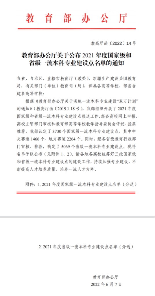 近日,教育部办公厅公布《关于公布2021年度国家级和省级一流本科专业建设点名单的通知》,我院药学专业喜获国家级一流本科专业建设点。