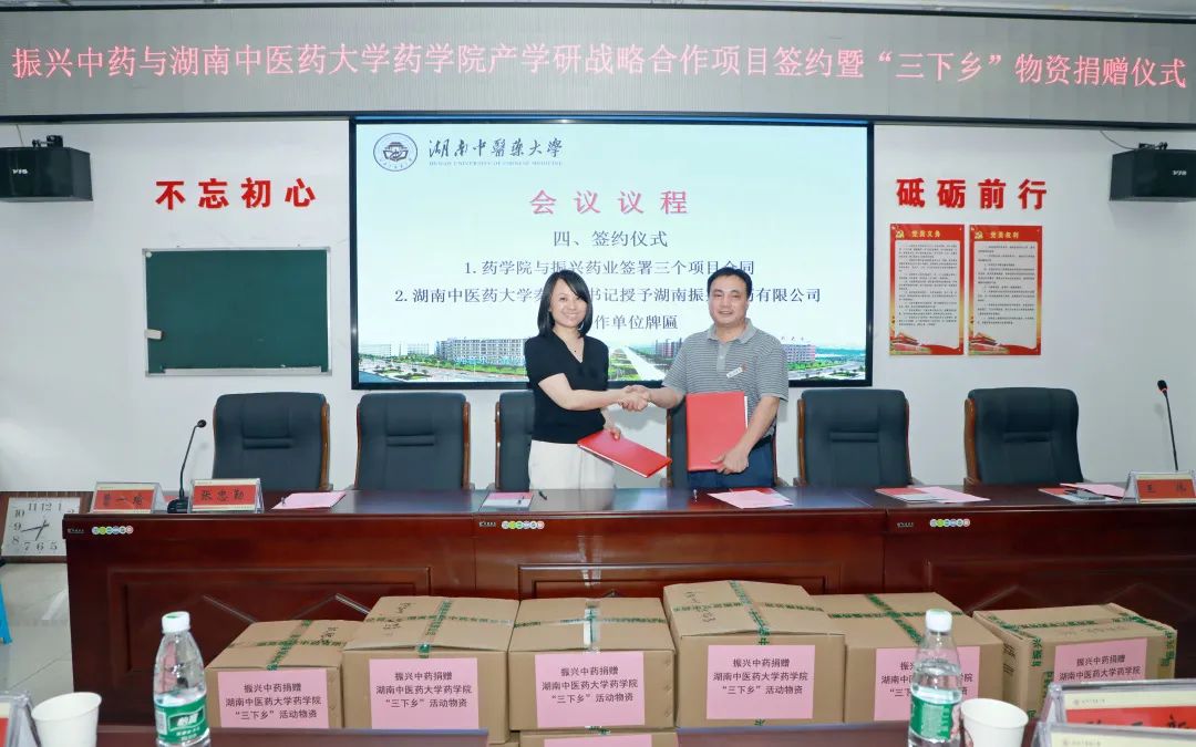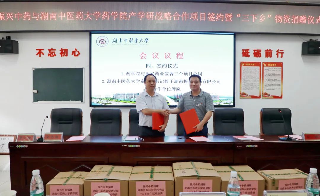 6 月 24 日,学校与湖南振兴中药有限公司校企战略合作签约仪式在大学yl23455永利官网举行。校党委书记秦裕辉、湖南振兴中药有限公司彭贵华董事长、科技处处长田雪飞、校科技处、yl23455永利官网和湖南振兴中药有限公司相关负责人参加此次仪式。仪式由yl23455永利官网王炜副院长主持。