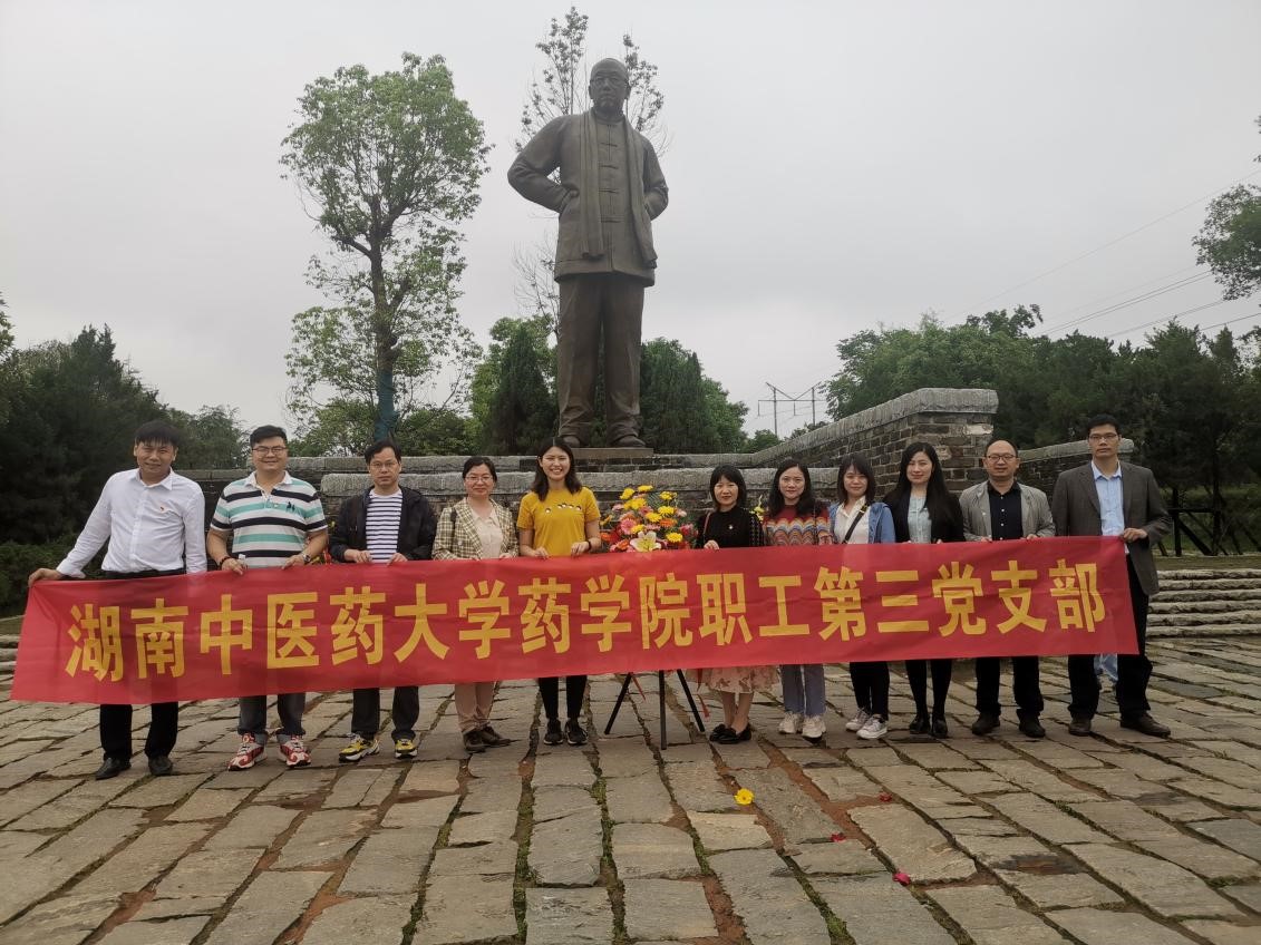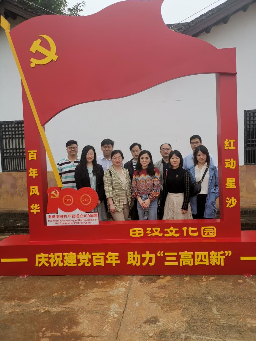 第一站,我们来到了位于长沙县果园乡的田汉故居,在田汉故居前重温了入党誓词,三支部一行12人在田汉铜像前敬献花篮,集体默思如何做好一个共产党员,一个为教育事业奉献的教科研工作者。有幸的是,在田汉剧场附近碰到了兄弟院校中南林科大马克思学院的教师队伍,我们跟兄弟院校的党员同志进行了党建、教学与科研人生方面的深度交流,互相介绍并了解彼此党支部学史增信和学史崇德活动的开展情况。