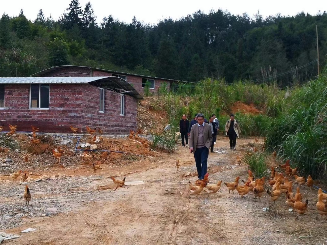 调研团队一同前往了洪流村中药材养鸡场,查看了场区的场房、用电、道路等配套设施建设。蒋俊队长介绍,养鸡场今年上半年开始建设,年底产品即可投入市场收益,预计可为村集体创造经济收入超过20万元,给群众带来实实在在的收益。