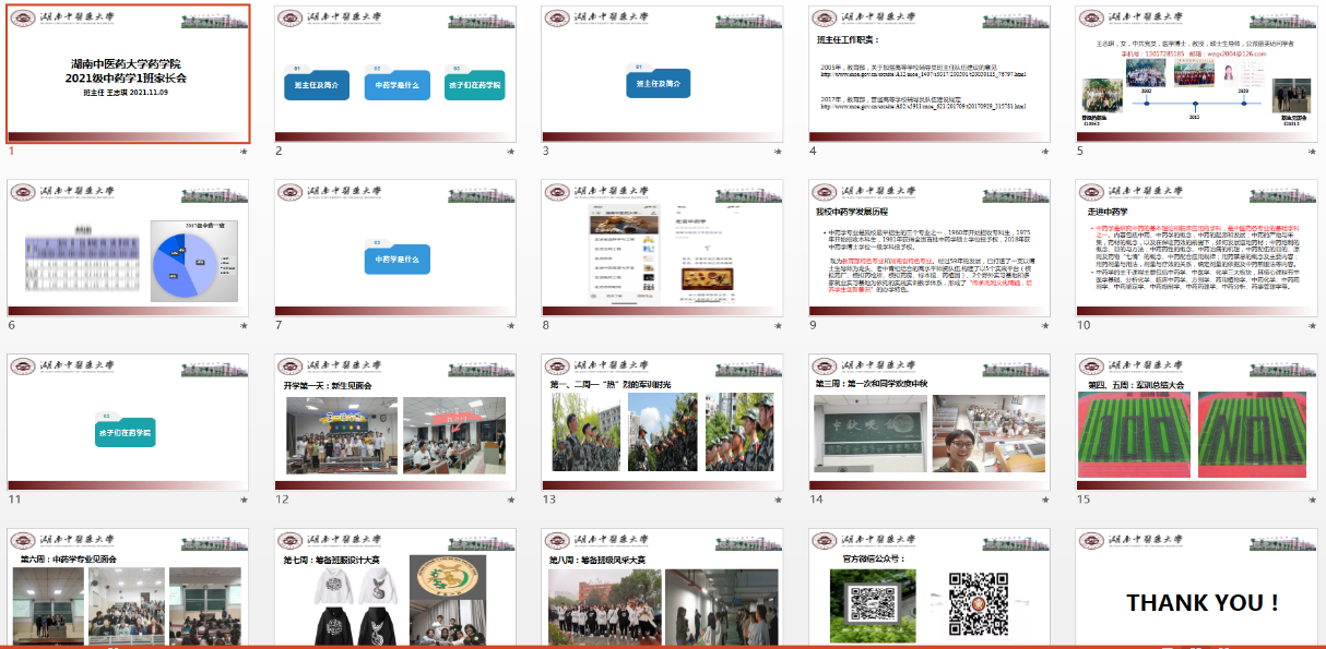家长会上,王志琪首先对班主任工作职责、个人经历和曾带教的2017级中药学1班本科毕业生的毕业去向进行讲述;接着向家长们介绍了湖南中医药大学中药学专业的发展历程、办学特色和中药学学科概况;然后向家长分享了学生们2个月以来在校期间的军训、学习、生活和班级活动等;最后对家长们关心的疫情防控、人才培养、保研、就业等问题进行了解答。会议期间,各位家长积极配合,认真听取班主任的介绍,王志琪也对各位家长提出的问题进行了详细解答。为方便后期家长了解学校、学院、专业及学生在校动态,还建立了2021级中药学1班家长群。