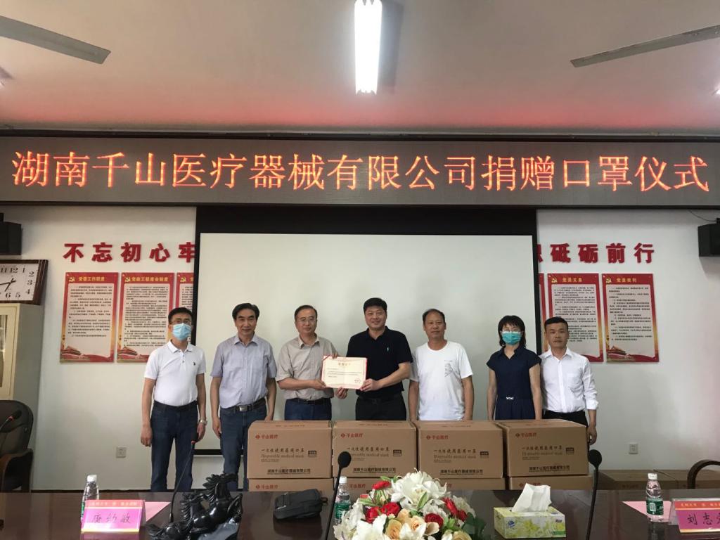 继企业复工复产、中小学生复学之后,我校已于近日实现全面复学,值此返校复学的关键时期,为助力学院疫情防控工作的顺利开展,为学院师生提供强大的健康保障,5月18日上午10:00,湖南千山医疗器械有限公司事业部总经理李霨,常务副总经理唐幼敏,销售部经理刘志宏一行人携两万余只爱心口罩赴我院进行捐赠。捐赠仪式于实验楼B栋4楼yl23455永利官网会议室举行,大学副校长熊辉,yl23455永利官网党委书记曹一瑜,yl23455永利官网院长夏新华、副院长裴刚,yl23455永利官网有机药化教研室主任彭东明及学院部分师生参与此次捐赠仪式。
