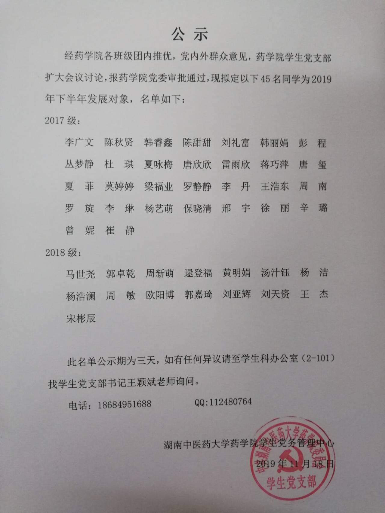 yl23455永利官网2019年下半年预备党员发展对象名单公示