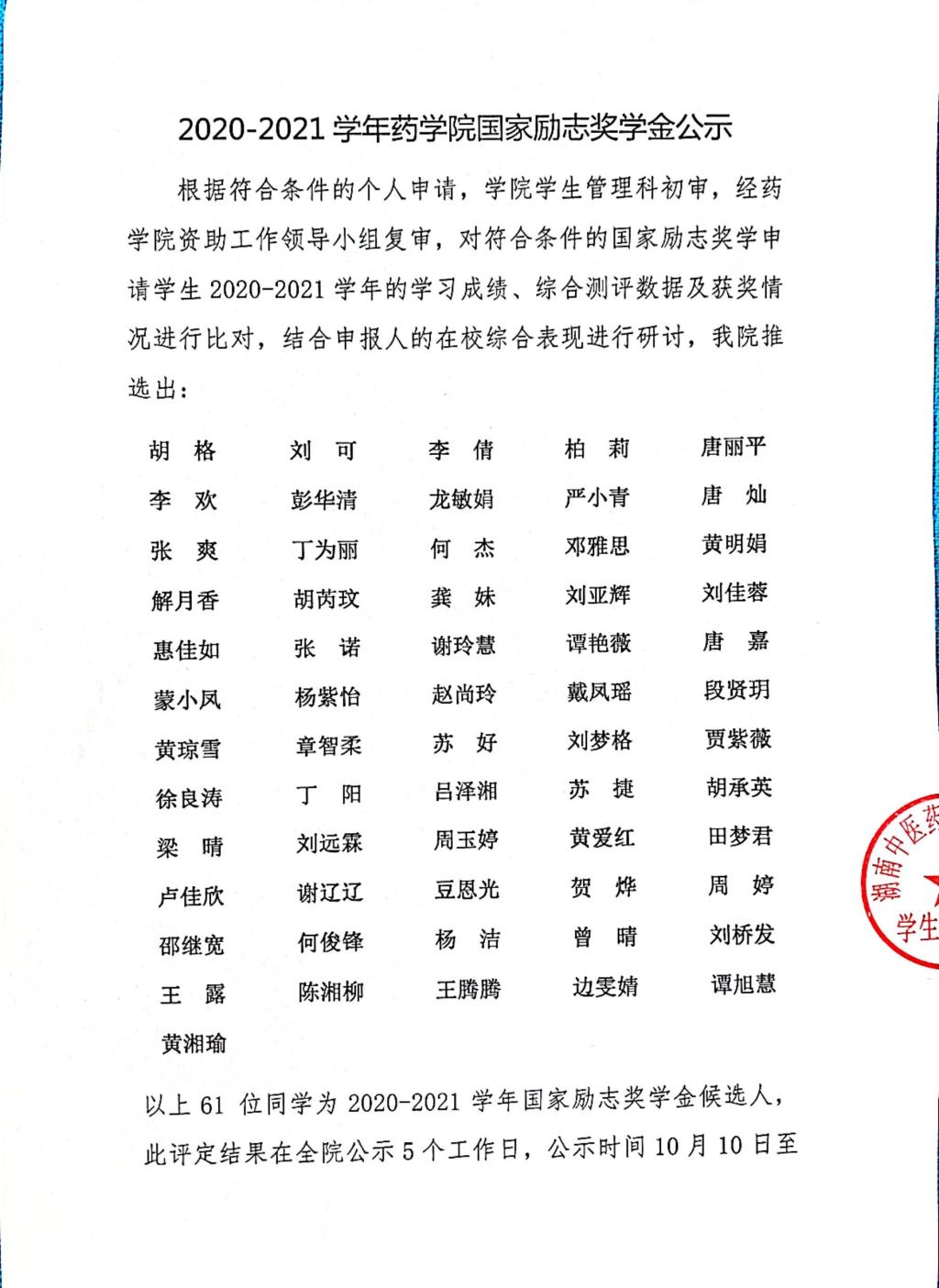 2020-2021学年yl23455永利官网国家励志奖学金公示
