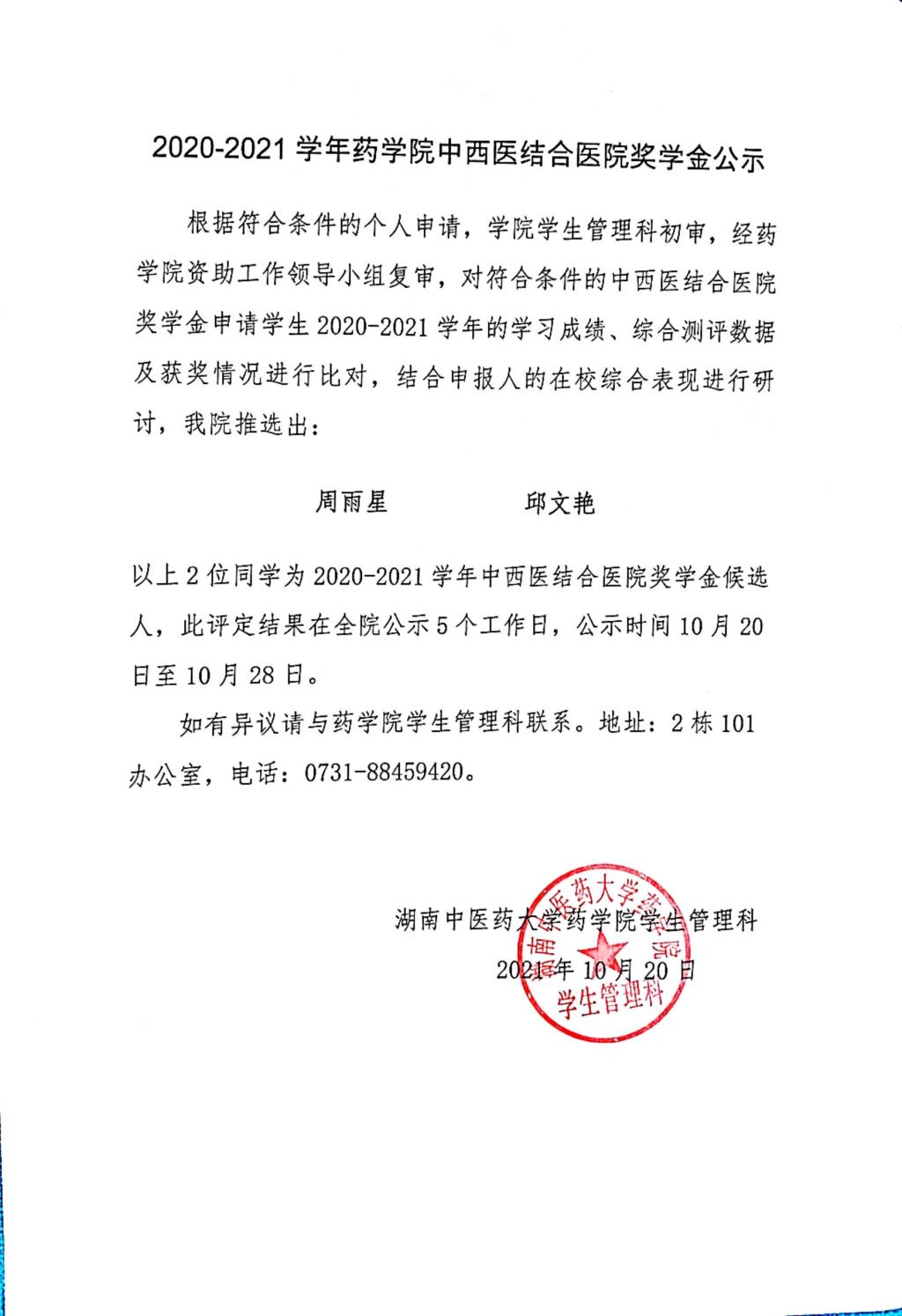 2020-2021学年yl23455永利官网中西医结合医院奖学金公示