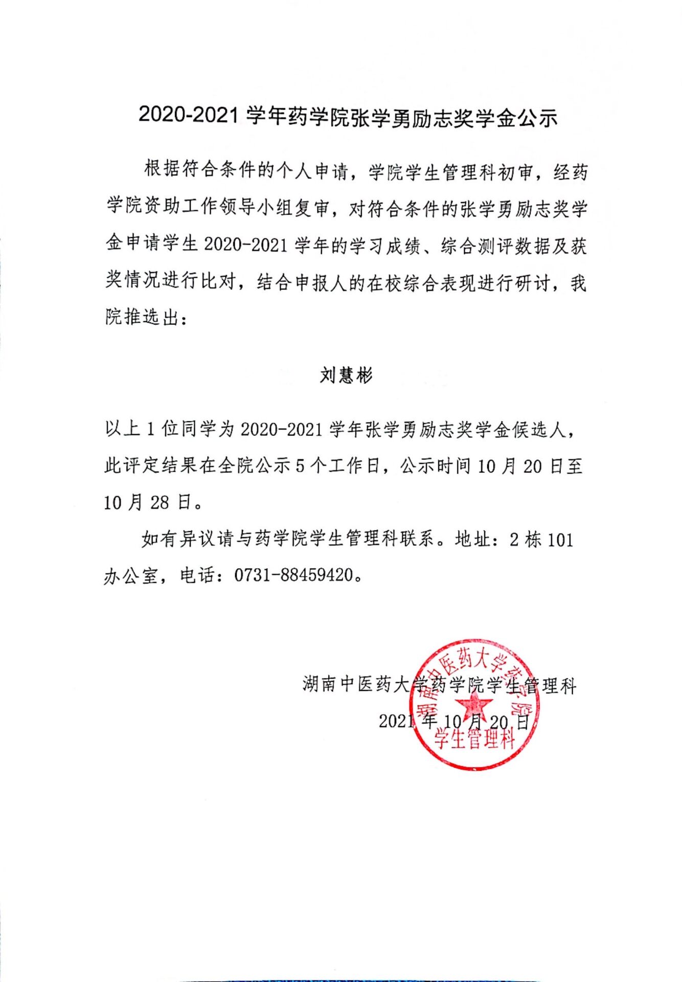 2020-2021学年yl23455永利官网张学勇励志奖学金公示