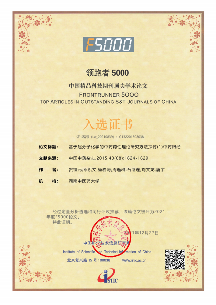 2021年12月27日,我院贺福元教授团队科研成果荣获2021年度F5000论文(领跑者5000∙中国精品科技期刊顶尖学术论文)。论文《基于超分子化学的中药药性理论研究方法探讨(1)中药归经》于2015年4月发表在《中国中药杂志》第40卷第8期。我院贺福元教授为论文第一作者及通讯作者,我校为第一通讯单位。成果由我校中药成药性与制剂制备湖南省重点实验室贺福元教授团队独立完成。