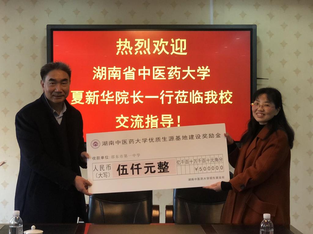 夏新华代表湖南中医药大学交付邵东一中奖励金奖牌