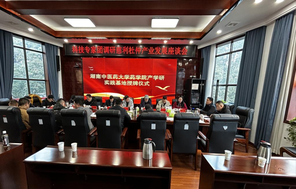专家科技服务团先后走访了湖南神舟医药集团,张家界绿春园茶叶有限公司,慈利县中医院,深入了解慈利杜仲种植、加工、销售及其临床应用的情况,并参加了慈利杜仲产业发展座谈会及产学研基地授牌仪式。