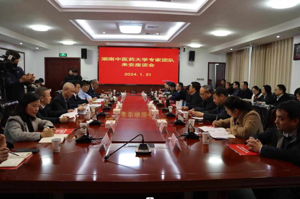 戴爱国一行还参加了湖南中医药大学专家团队来安座谈会。大学党政办公室、宣传统战部、科技处、yl23455永利官网、国际教育学院、省药品监督管理局、湖南新汇制药股份有限公司、湖南佰骏高科医疗投资管理有限公司、湖南振兴中药有限公司、九芝堂股份有限公司、中国建设银行等相关部门、企业及银行代表参与揭牌仪式及陪同座谈,企业代表和专家团队纷纷就安仁县中医药产业发展献言献策。