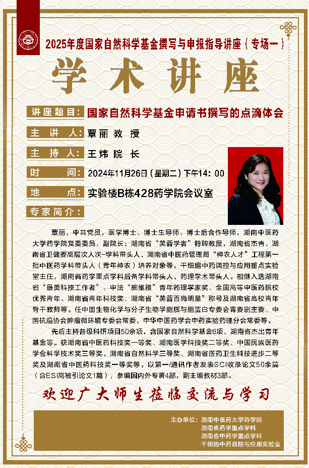 11月26日下午,yl23455永利官网成功举办2025年度国家自然科学基金项目标书撰写指导首场讲座。湖南中医药大学教授、博士研究生导师覃丽受邀作专题报告,旨在精准提升我院国家自然科学基金项目申报质量。学院党委书记张熙、学院院长王炜出席会议,学院45岁以下青年教师及其他学院部分教师参会。讲座由王炜主持。