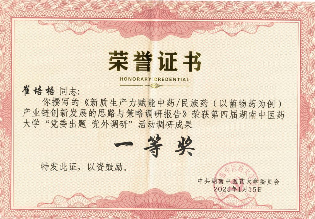 ”荣获农工党省委会调研报告二等奖,校本部支部主委崔培梧撰写的“新质生产力赋能中药/民族药(以菌物药为例)产业链创新发展的思路与策略”荣获第四届湖南中医药大学“党委出题 党外调研”一等奖。
