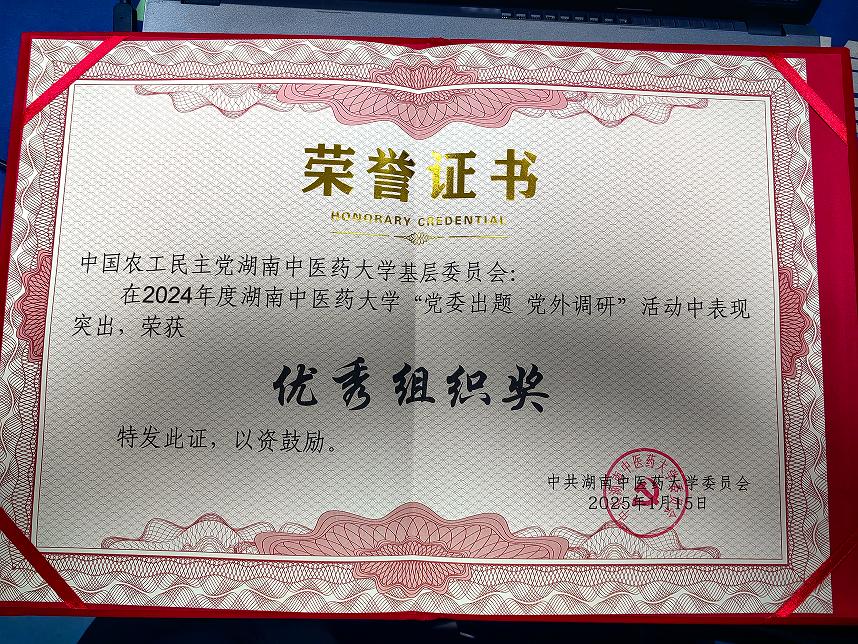 2024年度,农工党基层委荣获“党委出题,党外调研”优秀组织奖,基层委主委童巧珍撰写的“聚焦湘产道地药材品牌建设,促进中医药传承创新发展