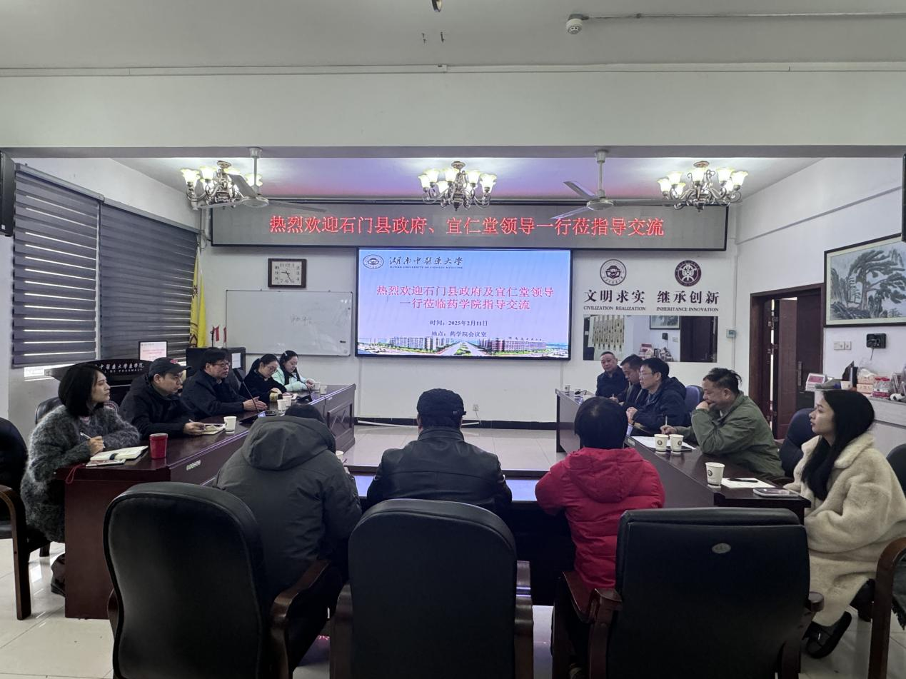 2月11日,石门县中药和林下经济产业发展工作专班负责人龚云林及湖南宜仁堂中药饮片有限公司总经理程立东一行来访我院进行交流座谈,学院院长王炜及相关人员参加交流。