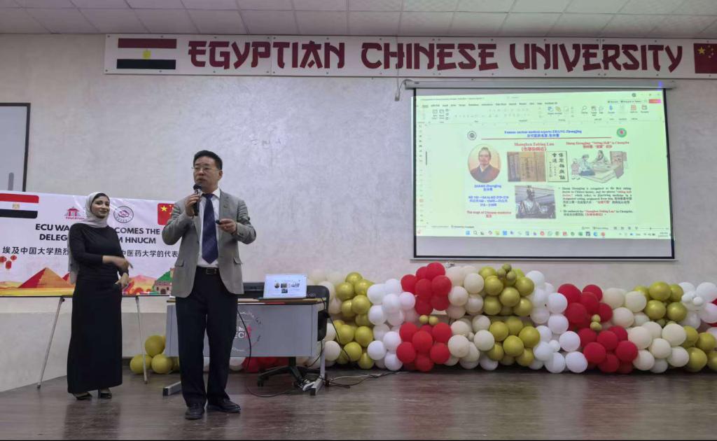 访问期间,王炜为埃及中国大学yl23455永利官网的师生们带来了一场题为《基于湖南中医药与民族医药的天然产物研究》的精彩学术报告。报告中,王炜深入浅出地介绍了湖南丰富的中医药和民族医药资源,详细阐述了团队在天然产物研究领域的最新成果,如活性成分的精准提取、高效分离、鉴定以及药效评价等。报告中先进的科研理念、前沿的研究方法,引发了现场师生的浓厚兴趣和热烈讨论。
