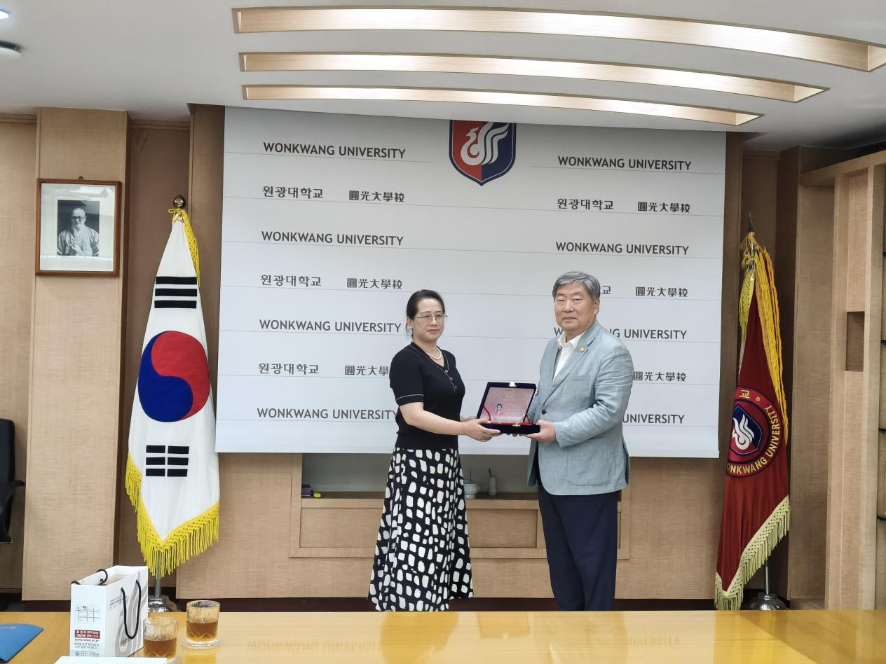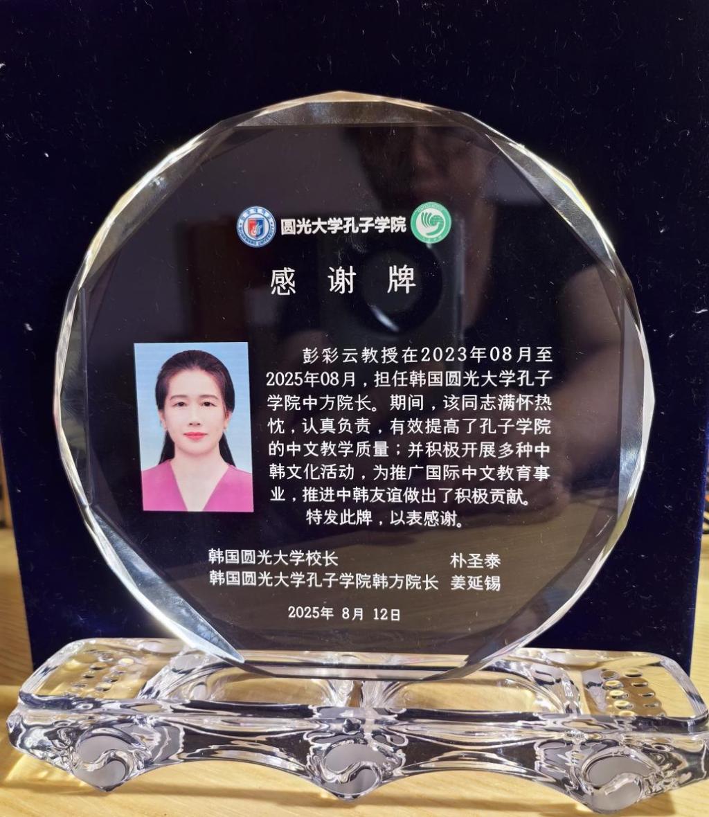 8月11日,在圆光大学校长办公室举办了孔子学院中方院长离任仪式。圆光大学校长朴圣泰为彭彩云同志颁发了致谢铭牌,圆光大学副校长黄珍洙、田炳薰,以及国际处处长(兼孔子学院韩方院长)、校长秘书室长,孔子学院全体老师参加了离任仪式。诚如致谢铭牌所言:彭彩云教授在担任韩国圆光大学孔子学院中方院长期间,满怀热忱、认真负责,有效提高了孔子学院的中文教学质量;并积极开展多种中韩文化活动,为推广国际中文教育事业、推进中韩友谊做出了积极贡献。