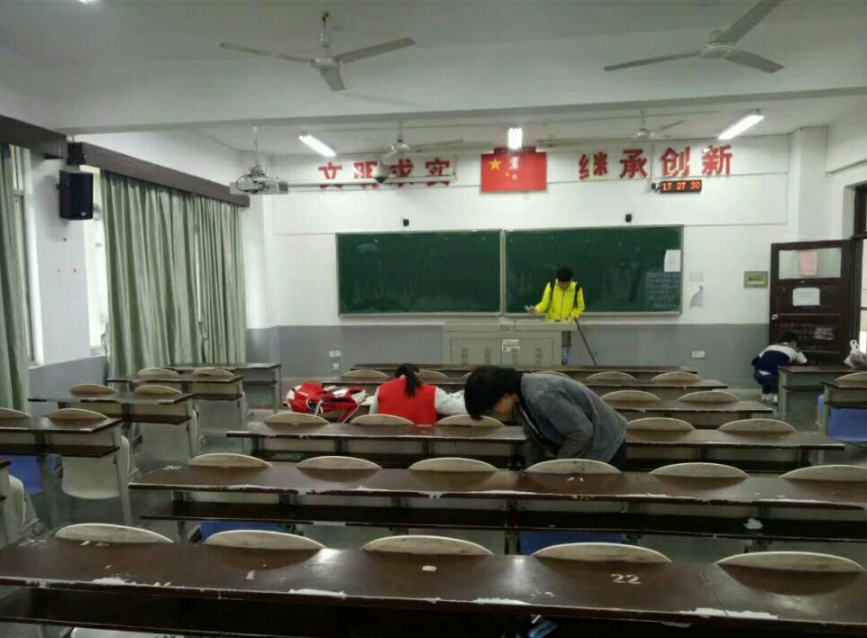 在所有班级下课后,所有参加此次活动的人员带着清洁工具进入教学楼。本次活动分工明确,人员安排合理。清洁工作主要有擦黑板,清扫教室等。