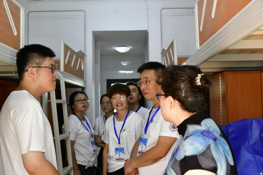 随后,全体院领导还前往本科学生宿舍,研究生四海通达宿舍,与今年新入校的学生进行了亲切地交流。在走访过程中,迎新工作组长、学院院长王炜对于新生的到来,表示欢迎,同时关切学生入住感受:“第一天来学校,对寝室的住宿条件还满意吗?”。学院党委书记曹一瑜则细致地询问同学们对于新环境气候、饮食等方面的适应情况。