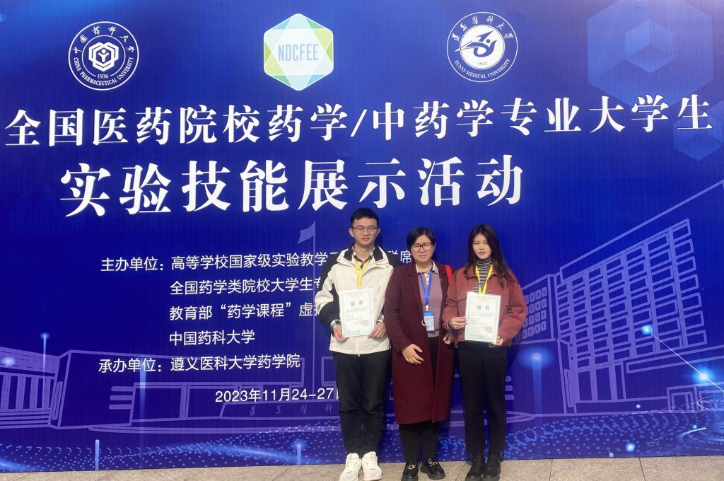 11月25-26日,“第七届全国医药院校药学/中药学专业大学生实验技能竞赛”于遵义医科大学举办。我院选派彭江丽为总教练,林丽美、罗堃、李亚梅、张智敏、刘月新为指导老师,2020级中药学专业豆恩光、药学专业李媚2位同学组成参赛队,最终荣获一等奖1项、二等奖1项。此次大赛为我校首次参加并荣获奖项!