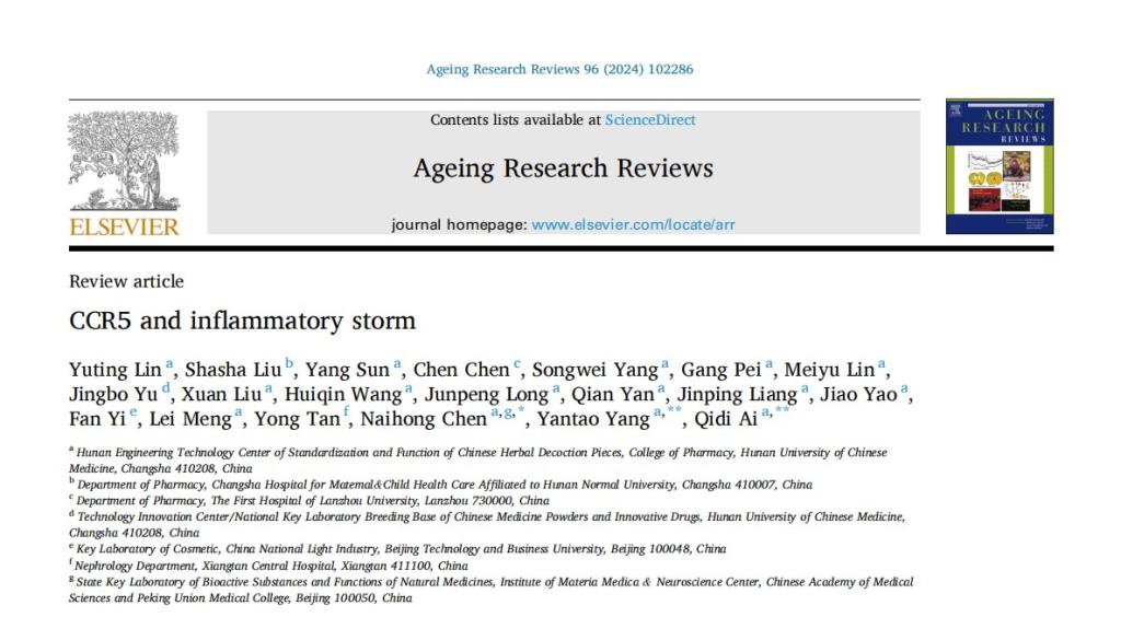 近日,我院硕士研究生林玉婷以第一作者在国际著名老年医学期刊《Ageing Research Reviews》(中科院1区TOP,Impact Factor:13.1)发表题为“CCR5 and Inflammatory Storm”的综述文章。