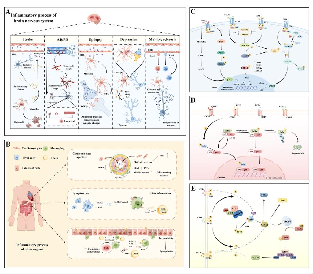 (A)CCR5与中枢神经系统炎症机制。CCR5已成为一系列脑部疾病(包括中风、阿尔兹海默病、帕金森病、癫痫、抑郁症和多发性硬化症)相关炎症过程的重要参与者。(B)CCR5和其他器官炎症机制。CCR5与心肌梗死/心肌缺血再灌注损伤、肝炎和炎症性肠病相关炎症过程有关。(C)CCR5参与MAPK通路机制介导炎症过程。(D)CCR5参与NF-κB通路机制介导炎症过程。(E)CCR5参与PI3K/Akt and mTOR通路机制介导炎症过程。