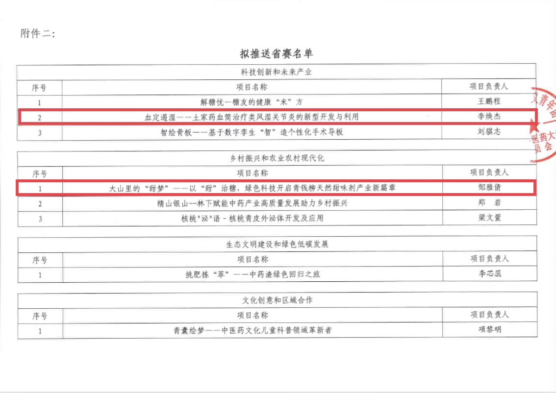5月11日,共青团湖南中医药大学委员会发布了《2024年湖南中医药大学“挑战杯”大学生创业计划竞赛校赛获奖名单》。我院由余黄合等老师指导,李焕杰等同学负责的《血定遏湿——土家药血筒治疗类风湿关节炎的新型开发与利用》项目荣获科技创新和未来产业组别一等奖,由田星等老师指导、邹雅倩等同学负责的《大山里的“甜梦”——以“甜”治糖,用科技力量酿造青钱柳甜蜜产业》项目荣获乡村振兴和农业农村现代化组别一等奖。以上两支参赛团队负责的项目均获得拟推送参加省赛资格。
