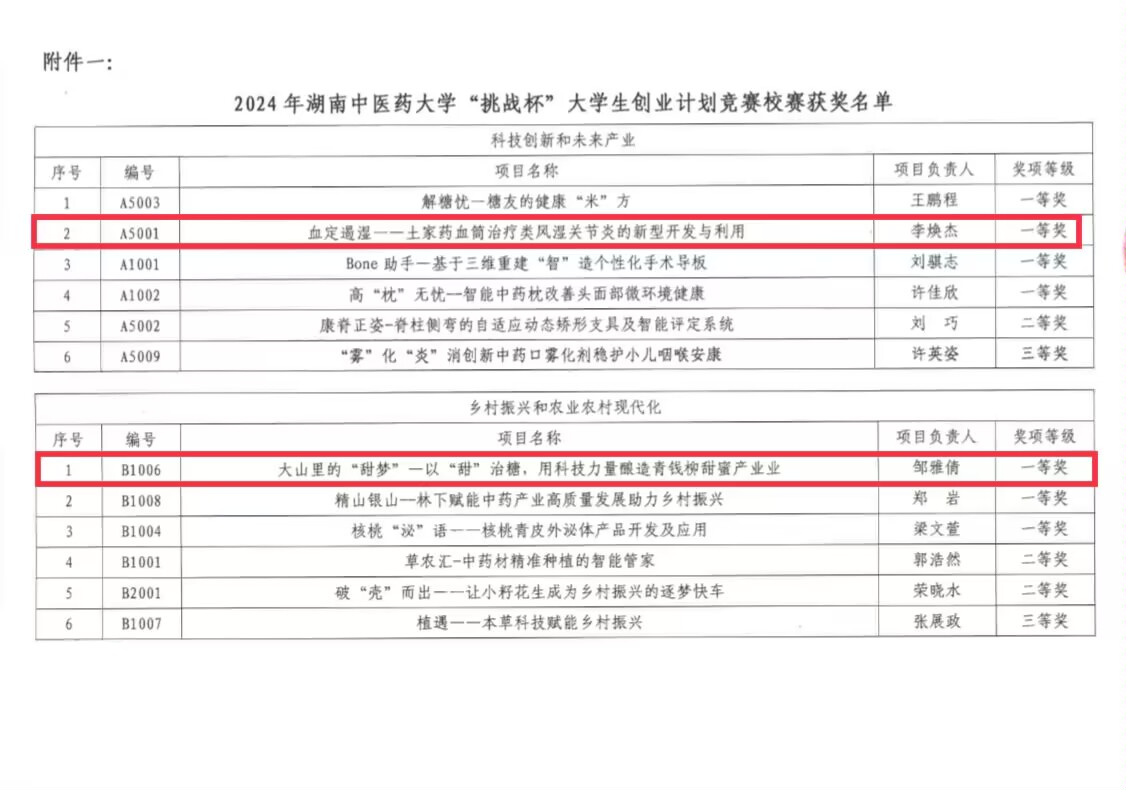 喜报!我院荣获2024年湖南中医药大学“挑战杯”大学生创业计划竞赛一等奖两项