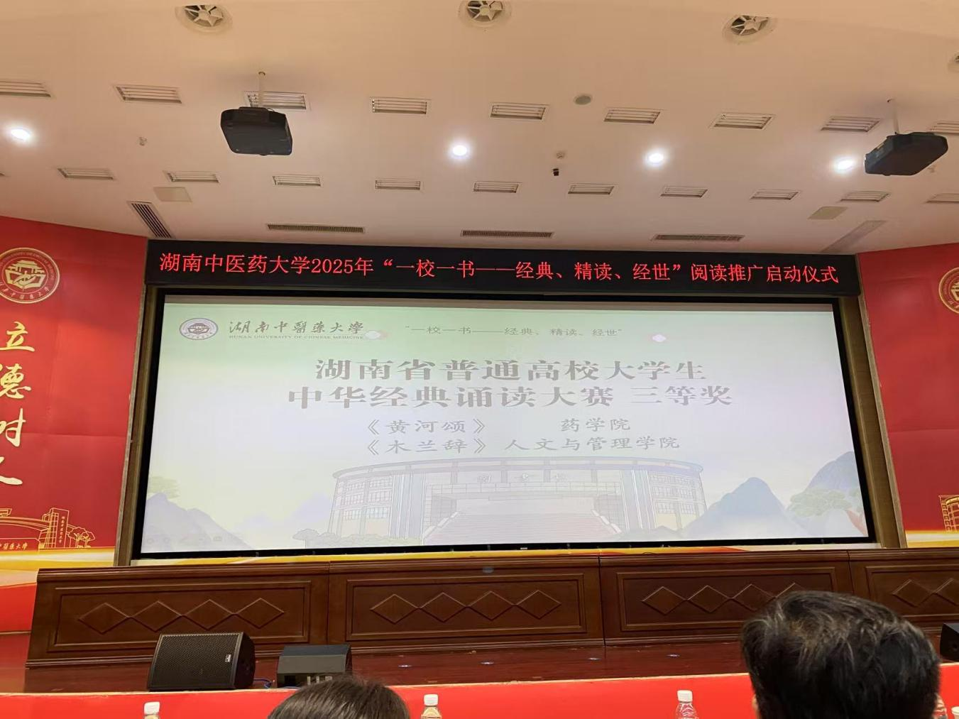 4月24日,湖南中医药大学2025年“一校一书——经典、精读、经世”阅读推广启动仪式在济世楼学术报告厅举行。我院2023级制药工程班陆飞、2023级制药工程班刘南震同学双人朗诵的《黄河颂》荣获湖南省普通高校大学生中华经典朗诵大赛的三等奖,并在仪式上获得表彰。